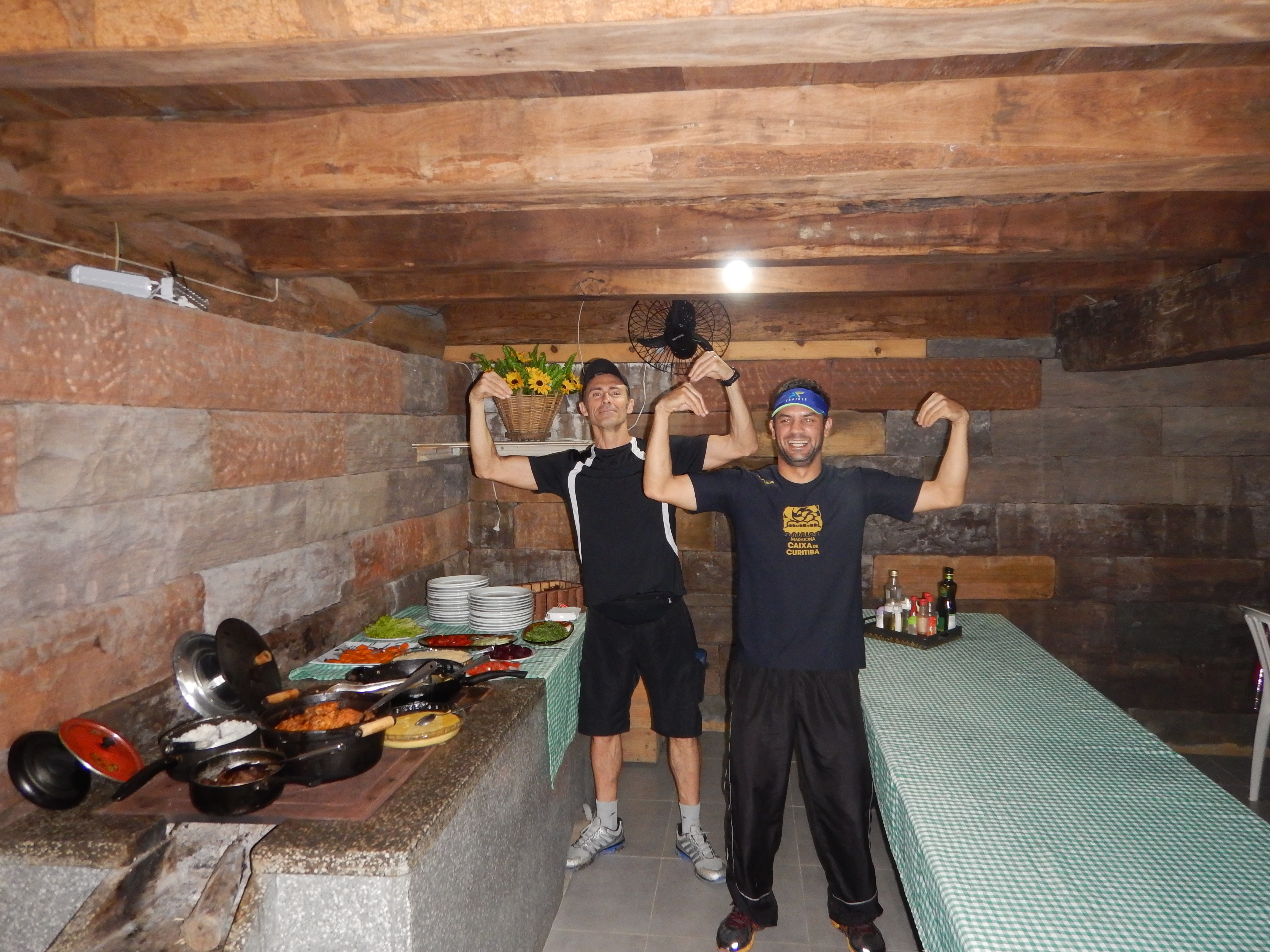 E se existe coincidência ou não , deixa para lá, mas essas foram as nossas poses sem ensaio ou previsão exemplificando força antes do nosso jantar, diga-se de passagem nota millll!! É só reparar no fogão de pedra e nos quitutes catarinenses!! Perto do nosso campeão se falarmos de corrida e performance, é nessa pose o mais perto que vamos chegar!!rsrsr Posso falar por mim e pela Sheila , quanto ao Fabiano Martins e a Rafa Ela…deixo com eles a palavra!! Ps: Horas antes de conhecermos Marcelo Rocha , definitivamente o Ninja Master!!