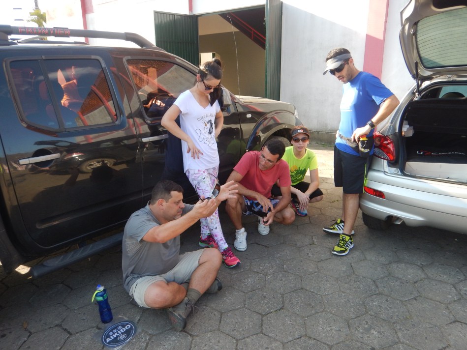 No momento reunindo a turma, Douglas Fronza contava sua experiência ao caminhar mais de 200 km no Desafio Off Roaders na Praia do Casino. Foi solo em total autossuficiência com sua mochila cargueira, barraca e o item principal… o mental treinado!